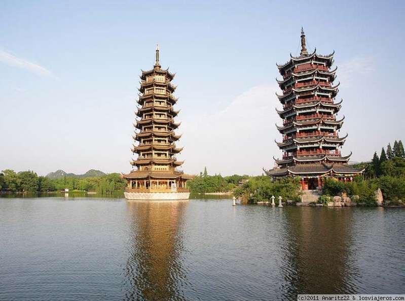 At Lake Shan Hu are two buildings that have become characteristic image of the city of Guilin: Buddhist pagoda style of the Sun and the Moon. The golden pagoda is known as the Pagoda of the Sun, and silver is the Pagoda of the Moon.