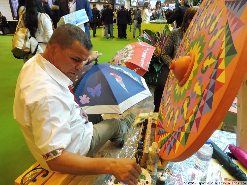Pintor de artesanía en el stand de Costa Rica: en este caso está pintando un paraguas.