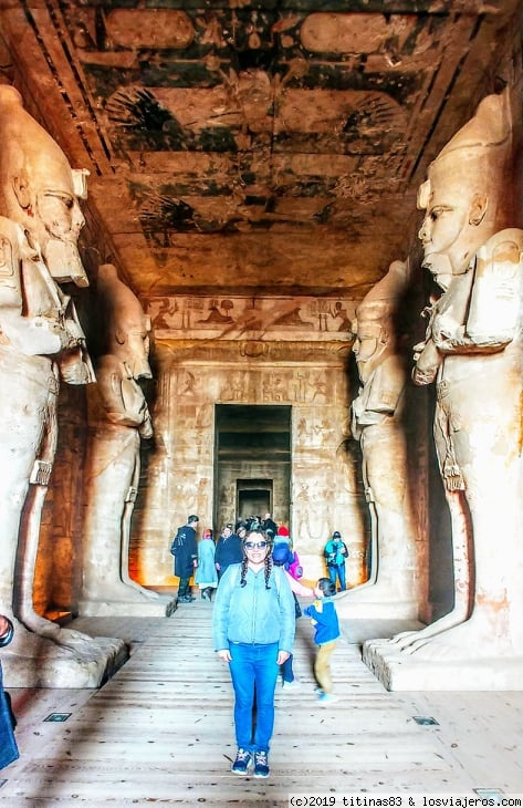 en el interior del templo se encuentra la gran sala hipóstila, de 18 metros de longitud y 16 de anchura cuyo techo está sostenido por 8 pilares osiríacos sobre los que se apoyan otros tantos colosos, 4 a cada lado que representan a Osiris con los rasgos de Ramsés II.