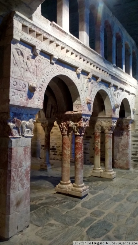 Monasterio del siglo Xi. Detalle del claustro y de la tribuna de mármol rosa del Conflent, una preciosidad del arte románico.