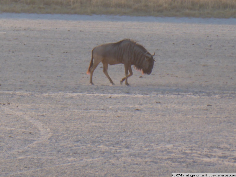 Figura de un solitario ñu que parece haberse quedado rezagado en el Sua Pan (Makgadikgadi Pans)