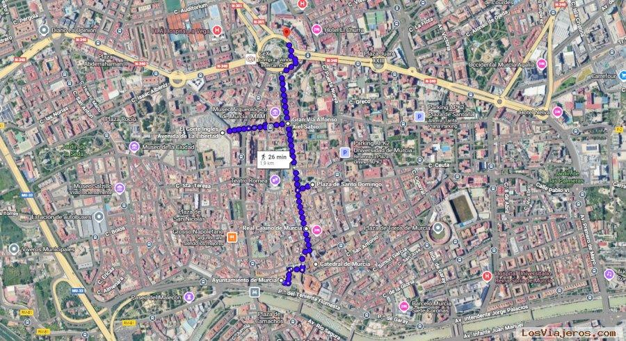 Os comentamos la ruta completa que hemos seguido: comenzamos en la glorieta de España, frente al ayuntamiento, seguimos por la plaza de la catedral y continuamos por la calle Traperías, paramos en el Real Casino, luego a la plaza de Santo Domingo, continuamos por la avenida de Alfonso X el Sabio y su extenso mercadillo navideño artesano, nos desviamos hasta el Corte Ingles para ver su espectáculo Cortylandia. Volvemos a la avenida Alfonso X, continuamos por el mercadillo y acabamos en la Plaza Circular