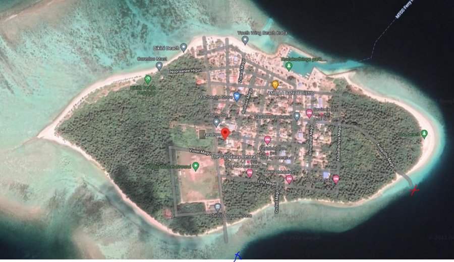 Aquí ves he marcado en el mapa una cruz roja para el inicio del snorkel y una azul el final. Intento subir una imagen y un enlace a un vídeo de un poco de snorkel en Feridhoo, soy un poca mala con los vídeos.