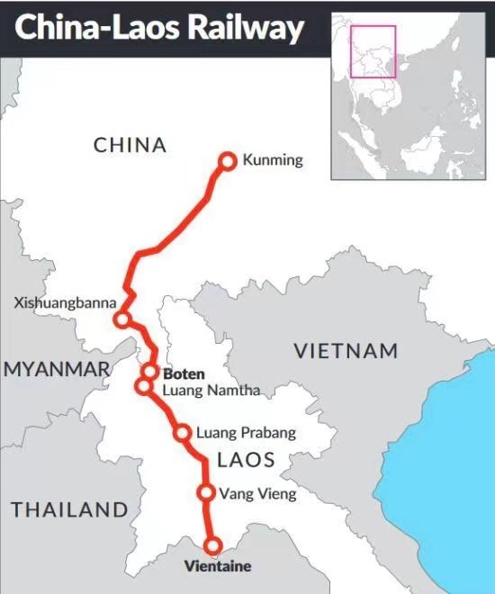 En el día 2 de Diciembre del 2021 queda inaugurada la operativa del TREN TGV desde la ciudad de Kunming, capital de la provincia de YUNNAN, a la ciudad de Vientiane, capital de LAOS… la inauguración coincide con el 46o aniversario de la República Popular Democrática de Laos.