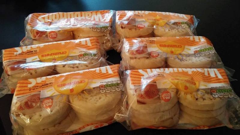 He aquí la prueba gráfica, con los 6 paquetes de crumpets que me quedé tras el reparto. Los otros 2 fueron para otra cuñada, porque esa vez me tocó a mi... ¡¡¡Traer los crumpets!!!