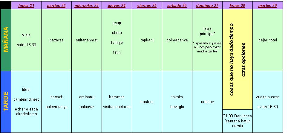 Aquí os dejo un planning un poco rudimentario de cómo pretendo verlo. He dividido las jornadas en mañana y tarde y he colocado , en la mayoria de las ocasiones, las zonas que visitaré (no los monumentos).