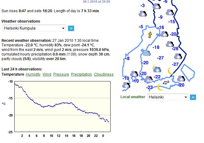 Fíjate si hace mucho más frío que eso que pones que hace unos días estaban a -25ºC. Me hace gracia la gente que va a un sitio tres días y según el tiempo que tengan esos días ya creen que siempre es así, como si en España no cambiaran las temperaturas de una semana para otra, pues imaginaros allí, que es un clima mucho más extremo. Ahora mismo, día 27 de enero a las 00:30 en Helsinki están a -22ºC. Por supuesto, el puerto de mar está completamente congelado desde hace un mes, aproximadamente (os pego una captura de la webcam de hace unos días, justo detrás de la niebla están los rompehielos).
