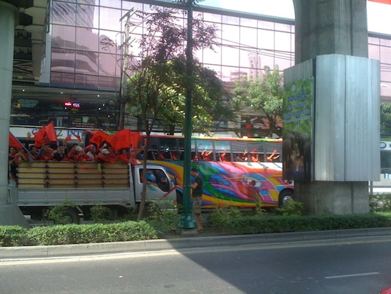 Actualización: han comenzado a pasar parte de los camisas rojas y la verdad es que no había visto a tanta gente así junta. Vienen en todo tipo de vehículos y están atascando Sukhumvit.