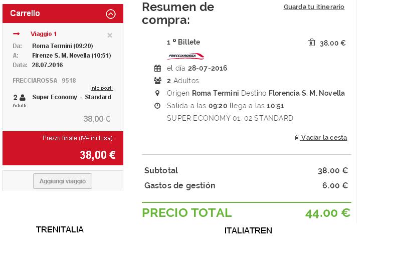 El tema es que el cachondo Google al buscar Trenitalia, nos ofrece en primer lugar la opción de Italiatren.es, y en nuestra cándida ignorancia dimos por hecho que era la versión para España de Trenitalia.com, dado que los horarios y precios que aparecen en las dos son los mismos, con la única diferencia del idioma y la apariencia de la página. El caso es que al cacharrear un poco más, avanzando hasta justo antes de rellenar los formularios y realizar el pago (dado que para investigar seleccionamos unas fechas en las que no estamos en Italia) hemos descubierto que mientras trenitalia mantiene los precios con iva incluido, italiatren nos añade un cargo de 3 € por cada billete y trayecto en concepto de gastos de gestión.