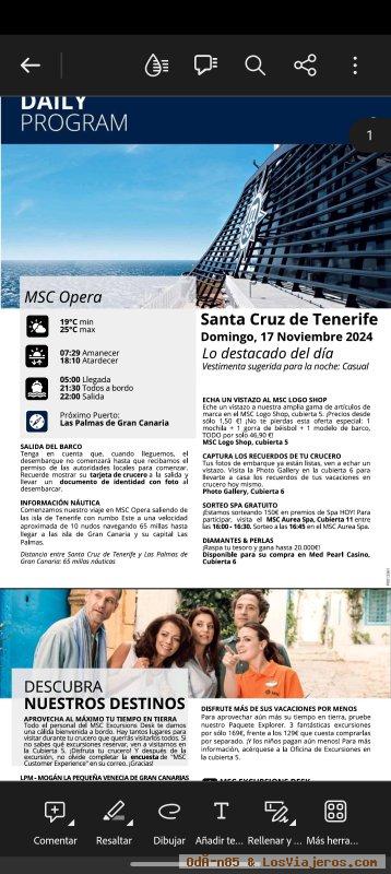 Solamente felicitar a Odin85, por esta laboriosa y magnífica descripción del crucero OPERA MSC, Canarias. Nunca en el tiempo que llevo registrado el Losviajeros, había visto una información tan detallada como la hecha por ODIN85. Yo acabo de desembarcar el 22/12 Santa Cruz de Tenerife. Y todo absolutamente lo expuesto en el chat ,se confirma en la realidad. Así que por mi parte GRACIAS